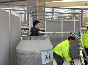 大神工業は「外構工事」のモックアップブースにて、私たちの生活に欠かせない実物のマンホールを持ち込み、雨水排水の仕組みを来場者の皆様に体感していただきました。実際にマンホールの中に入ったり、マンホールの蓋をあけたりする体験を通して、建設の「縁の下の力持ち」であるマンホールに親しみを持っていただけた様子でした。